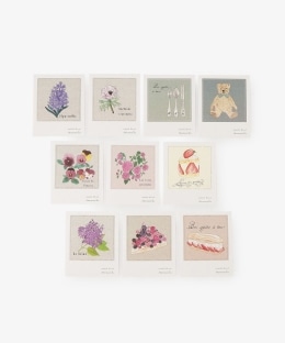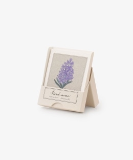 全10種類の異なる絵柄が3枚ずつセットになっています。しっかりとした厚手の紙を使用しているため、イラスト下の余白にひと言添えて、ちょっとしたお礼を伝えるメッセージカードとしてお使いいただくのもおすすめです。収納ボックスを組み立てるとそのままスタンドになる便利な仕様。サッと取り出してメモ書きができるだけでなく、使わない時も優雅なアートが小さなインテリアとして空間を彩ってくれます。