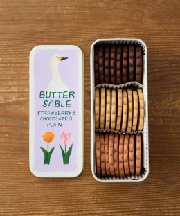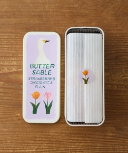 | 素材 | ○苺バター【小麦粉、バター、砂糖、卵、粉末苺、ストロベリーソース、ラズベリーパウダー、食塩/着色料(ラック)、酸味料、香料】○ショコラバター【小麦粉、バター、砂糖、卵、ココアパウダー、食塩】○プレーン【小麦粉、バター、砂糖、卵、食塩】 |