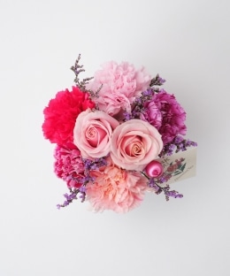 母の日に贈るお花の代名詞・カーネーションやバラなどを組み合わせました。インテリアにも取り入れやすい小ぶりなサイズ感がポイントのアレンジメントです。