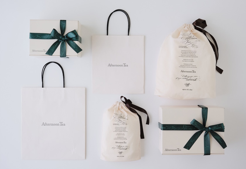 アフタヌーンティーオンラインストアでは、お客様ご自身でラッピングが可能な「ラッピングキット」も種類豊富に揃えています。 ボックスとリボン、またはコットンバッグと紙袋がセットになっていますので、ご希望の商品と併せてご購入ください。